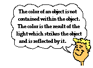 We have previously learned that visible light waves consist of a continuous range of wavelengths or frequencies. When a light wave with a single frequency strikes an object, a number of things could happen. The light wave could be absorbed by the object, in which case its energy is converted to heat. The light wave could be reflected by the object. And the light wave could be transmitted by the object. Rarely however does just a single frequency of light strike an object. While it does happen, it is more usual that visible light of many frequencies or even all frequencies is incident towards the surface of objects. When this occurs, objects have a tendency to selectively absorb, reflect or transmit light certain frequencies. That is, one object might reflect green light while absorbing all other frequencies of visible light. Another object might selectively transmit blue light while absorbing all other frequencies of visible light. The manner in which visible light interacts with an object is dependent upon the frequency of the light and the nature of the atoms of the object. In this section of Lesson 2 we will discuss how and why light of certain frequencies can be selectively absorbed, reflected or transmitted. Atoms and molecules contain electrons. It is often useful to think of these electrons as being attached to the atoms by springs. The electrons and their attached springs have a tendency to vibrate at specific frequencies. Similar to a tuning fork or even a musical instrument, the electrons of atoms have a natural frequency at which they tend to vibrate. When a light wave with that same natural frequency impinges upon an atom, then the electrons of that atom will be set into vibrational motion. (This is merely another example of the resonance principle introduced in Unit 11 of The Physics Classroom Tutorial.) If a light wave of a given frequency strikes a material with electrons having the same vibrational frequencies, then those electrons will absorb the energy of the light wave and transform it into vibrational motion. During its vibration, the electrons interact with neighboring atoms in such a manner as to convert its vibrational energy into thermal energy. Subsequently, the light wave with that given frequency is absorbed by the object, never again to be released in the form of light. So the selective absorption of light by a particular material occurs because the selected frequency of the light wave matches the frequency at which electrons in the atoms of that material vibrate. Since different atoms and molecules have different natural frequencies of vibration, they will selectively absorb different frequencies of visible light. Reflection and transmission of light waves occur because the frequencies of the light waves do not match the natural frequencies of vibration of the objects. When light waves of these frequencies strike an object, the electrons in the atoms of the object begin vibrating. But instead of vibrating in resonance at a large amplitude, the electrons vibrate for brief periods of time with small amplitudes of vibration; then the energy is reemitted as a light wave. If the object is transparent, then the vibrations of the electrons are passed on to neighboring atoms through the bulk of the material and reemitted on the opposite side of the object. Such frequencies of light waves are said to be transmitted . If the object is opaque, then the vibrations of the electrons are not passed from atom to atom through the bulk of the material. Rather the electrons of atoms on the material's surface vibrate for short periods of time and then reemit the energy as a reflected light wave. Such frequencies of light are said to be reflected . The color of the objects that we see is largely due to the way those objects interact with light and Consider the two diagrams below. The diagrams depict a sheet of paper being illuminated with white light (ROYGBIV). The papers are impregnated with a chemical capable of absorbing one or more of the colors of white light. Such chemicals that are capable of selectively absorbing one or more frequency of white light are known as pigments . In Example A, the pigment in the sheet of paper is capable of absorbing red, orange, yellow, blue, indigo and violet. In Example B, the pigment in the sheet of paper is capable of absorbing orange, yellow, green, blue, indigo and violet. In each case, whatever color is not absorbed is reflected. Transparent materials are materials that allow one or more of the frequencies of visible light to be transmitted through them; whatever color(s) is/are not transmitted by such objects, are typically absorbed by them. The appearance of a transparent object is dependent upon what color(s) of light is/are incident upon the object and what color(s) of light is/are transmitted through the object. The colors perceived of objects are the results of interactions between the various frequencies of visible light waves and the atoms of the materials that objects are made of. Many objects contain atoms capable of either selectively absorbing, reflecting or transmitting one or more frequencies of light. The frequencies of light that become transmitted or reflected to our eyes will contribute to the color that we perceive. 1. Natural philosophers have long pondered the underlying reasons for color in nature. One common historical belief was that colored objects in nature produce small particles (perhaps light particles) that subsequently reach our eyes. Different objects produce different colored particles, thus contributing to their different appearance. Is this belief accurate or not? __________________ Justify your answer. 2. What color does a red shirt appear when the room lights are turned off and the room is entirely dark? ____________ What about a blue shirt? ____________ ... a green shirt? ____________ 3. The diagrams depict a sheet of paper being illuminated with white light (ROYGBIV). The papers are impregnated with